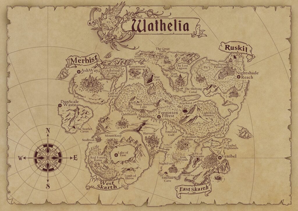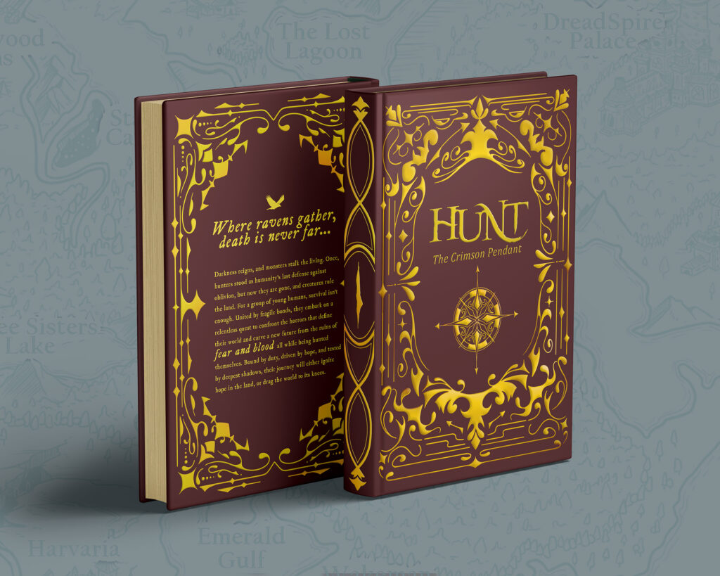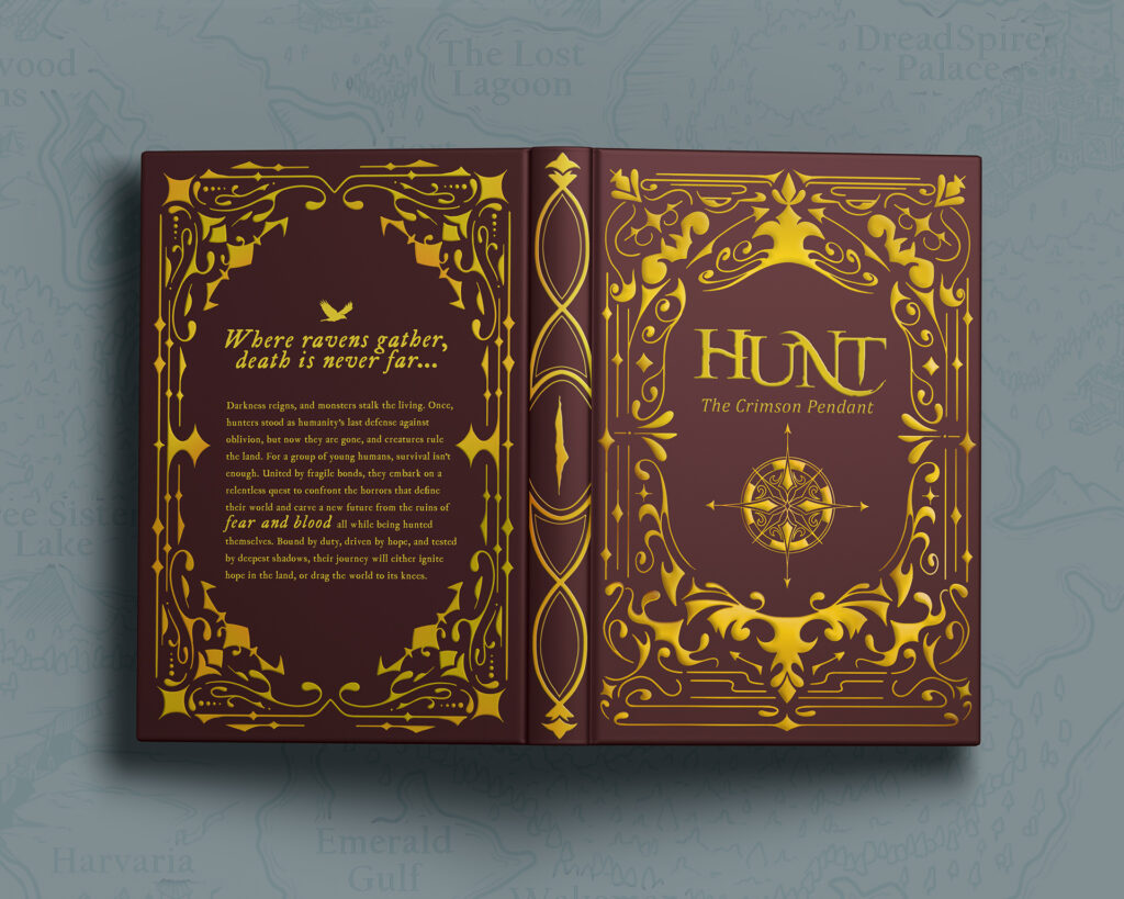 Hunt: The Crimson Pendant is a dark fantasy design project that blends intricate storytelling with rich visual worldbuilding. The book cover features ornate gold embellishments set against deep crimson tones, evoking an atmosphere of mystery, danger, and ancient power. Its companion map of Wathelia expands the narrative universe, illustrating a land steeped in myth, ruin, and forgotten legends. Together, the cover and map create an immersive experience. Melding traditional fantasy aesthetics with cinematic precision to bring the story’s world, lore, and tone vividly to life.